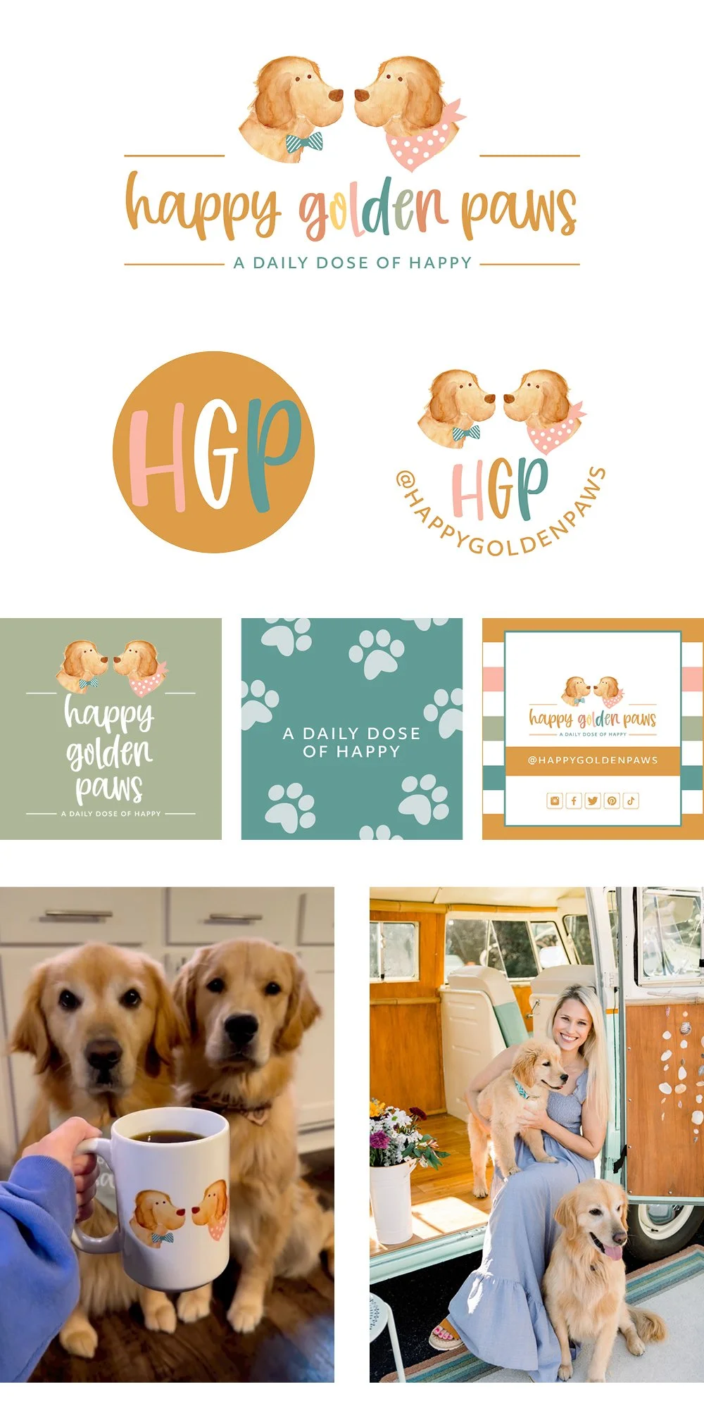 This was a rebrand project for Happy Golden Paws, a dog-centric brand that focuses on daily doses of happiness! With over 25,000 followers on Instagram, we needed a strong look for the feed that added to the light-hearted and fun personality of this brand. I also created a custom watercolor of Erin’s precious pups, Karen & Truman, with an earthy color palette to complement the trio’s outdoors-y and adventurous personalities.